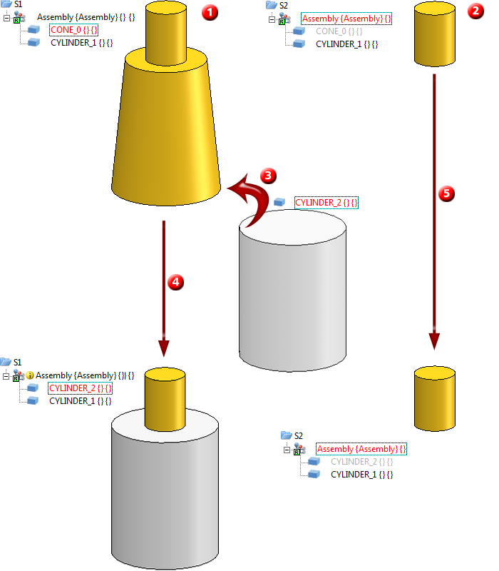 The drawing S1 (1) contains a referenced assembly, consisting of one Cone and one Cylinder. This assembly also occurs in the drawing S2 (2), with the difference that the Cone has been hidden in the active view there. When you now replace in the drawing S1 the Cone with a different part, e.g. a part called Cylinder_2 (3), the drawing S1 will be updated accordingly (4). When you now open the drawing S2, the assembly will also be updated there, i.e. the Cone will be replaced with the Cylinder, but the Cylinder remains hidden.