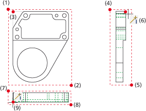 - Create a selection box (7), (8) for the top view and specify the start point of the upper edge as reference point (9).