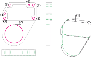 - Identify the 3-D model (1), then select the hole contours (2) - (8) in the front view.