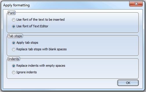You can also take over indents, tab stops, bullet lists and numbered lists of original texts. Texts that have been separated by tab stops will be arranged in columns when they are taken over. It can therefore make sense to replace the tab stops by blank spaces. You can specify the settings for the taking over of texts in the Apply formatting dialogue window.