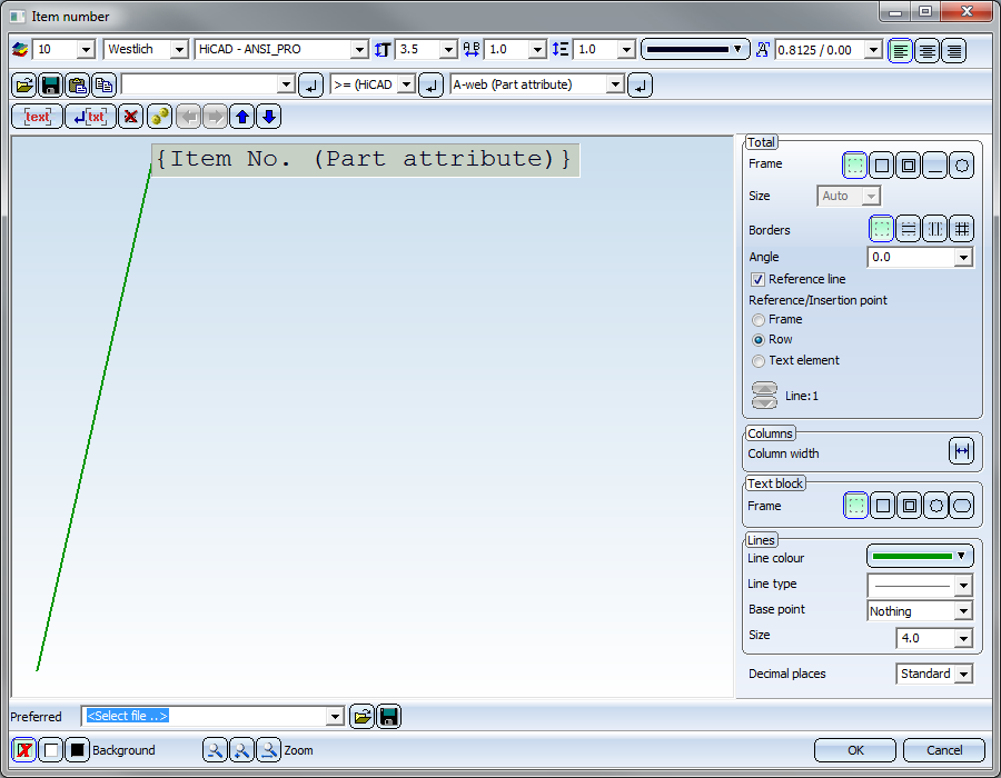 An annotation is composed of various text blocks. Each of these text blocks can consist of various text elements. These include part attributes, database attributes, special characters or any alphanumeric texts. The annotation you choose is displayed in the preview window. Each text block is marked by a plastic border, the active text block by a black border. Part attributes within a text block are displayed in curly brackets, database attributes being additionally prefaced by the string %DBAT.