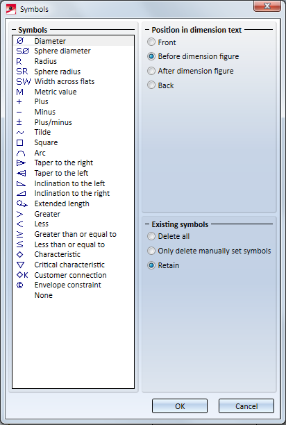 Select the desired symbol and specify the position of the symbol in the annotation. Specify in the Existing symbols area how to proceed with already existing symbols of a dimension.