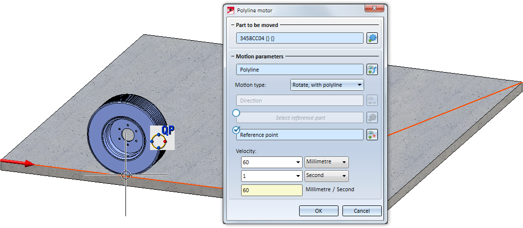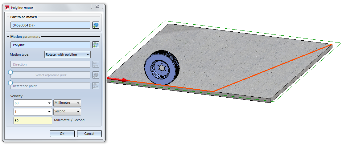function (the part to be moved: Wheel; Polyline: the blue sketch; Direction: Polyline; Motion type: Rotate with polyline; No reference point; Velocity: 60 mm/sec).