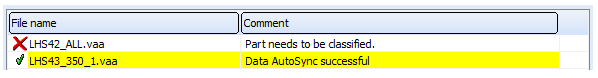 The icon in the first column on the list and the information given in the Comment column indicate whether the part data synchronisation for the corresponding part was successful, or if any errors occurred.