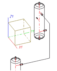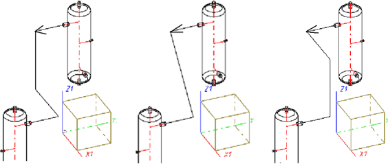 In this window HiCAD suggests the possible routes of the c-edge. Click the Next button to skip to the next alternative. Parallelisms between individual edges of the current guideline and the coordinate axes are also indicated.