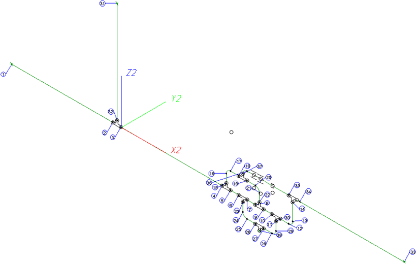 HiCAD creates a new sub-part of the pipelines main part, i.e. RBL0001, for dimensioning. The sub-parts SDR_ANL and MSL_ANL RBM_ANL are in turn created. The sub-parts Y_ANL_nnn containing rise triangles, are attached to the sub-part SDR_ANL. Rise triangles are consecutively numbered, i.e. nnn = 001, 002, 003 etc. Hi-CAD assigns any existing projection lines to MSL_ANL, e.g. automatically created projection lines for circular arcs.