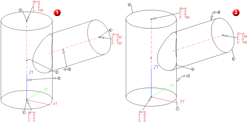 In the image below an inserted pipe points to the back and is therefore be hidden (1) if the construction is viewed from the front (1). Its item number tag has therefore been assigned to the second view (2):