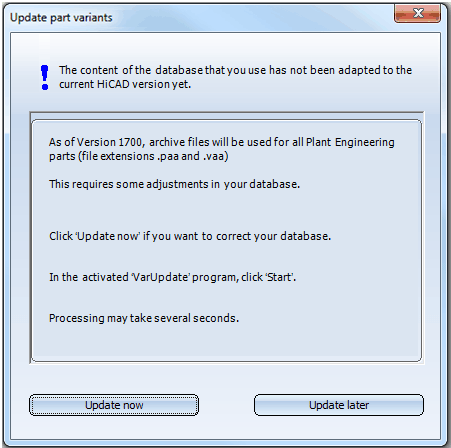 When you start HiCAD and the DBPlantDataImport tool, it is checked automatically whether an update of the variants will be necessary. If required, the updating will be performed automatically. You have the option to cancel the process, which will close the program. The program will also be closed if errors occur during updating of the variants.