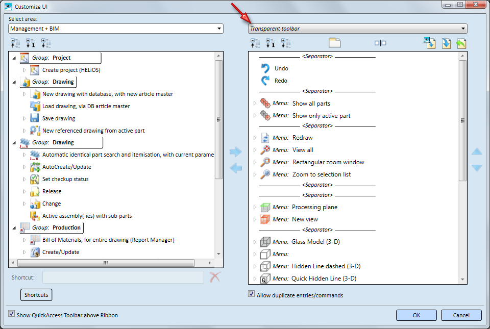 • If the selected entry already exists in the transparent toolbar while the Allow duplicate entries/commands checkbox is deactivated, the Add >> function will be locked!