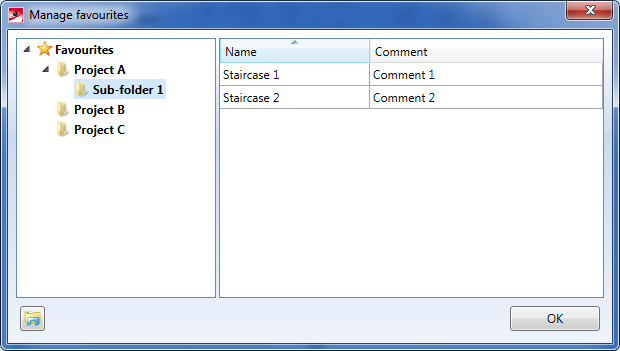 Manage favourites Use this function to rename delete, import, export Favourites or arrange them in folders. In addition, you can start the Windows Explorer via the dialogue window. The current folder is the Favourites folder of the active function, i.e., for instance, in the Configuration\FAVOURITES\SteelEngineering\STAIRCASEconfigurator directory of your HiCAD installation for the Railing Configurator in Steel Engineering.