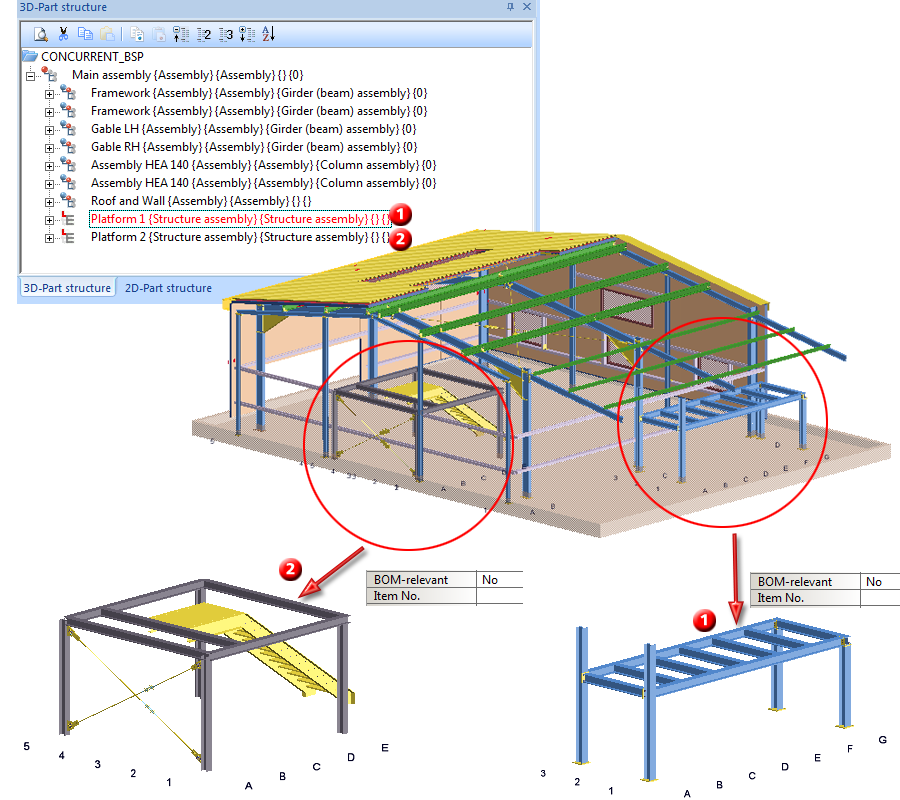 In this chapter the procedure will be described for both cases by means of an example. The example drawing is subdivided into assemblies / construction sections. In the example, the construction sections Platform 1 and Platform 2 must be structure assemblies! Of course, the procedure described in the example also applies to further assemblies/construction sections.