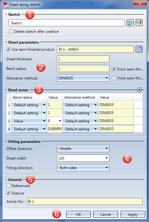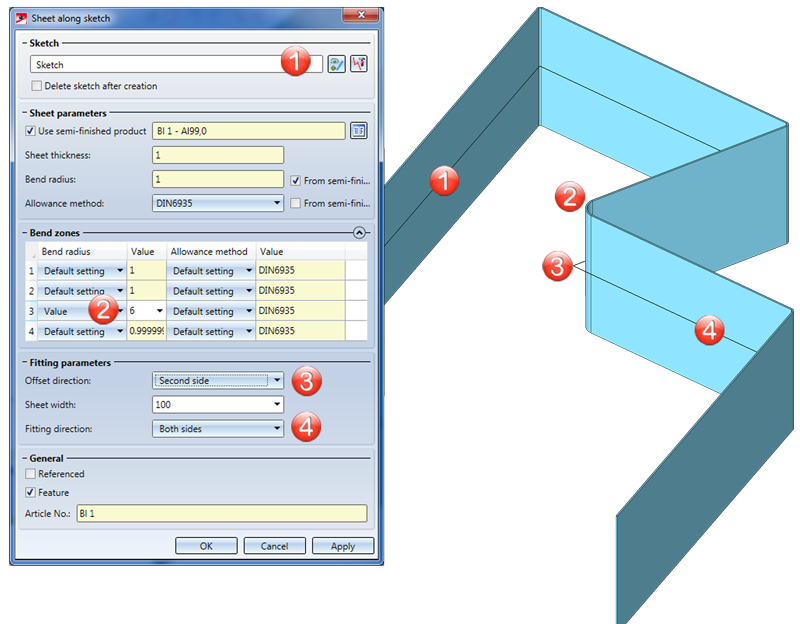 , a semi-finished product will be chosen from the Catalogue Editor, and no value input for sheet thickness will be required; instead, the Sheet thickness, the Material and the Article number will be taken from the Catalogue Editor. If you also want to take the bend radius from the Catalogue Editor, activate the