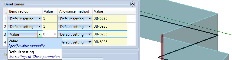 In the displayed table you can assign a value for the Bend radius and the Allowance method to each bend zone. Right-click