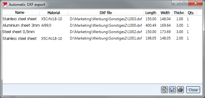 Sheets from list: All marked sheets and plates (part selection list) will be exported as a DXF file. The "quantity" of the parts per item number will be taken from the drawing - irrespective of the selected and displayed parts.