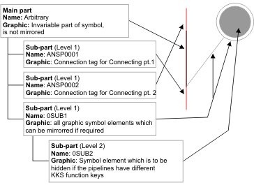 KKS pipeline division symbols are used to separate symbols or connections belonging to pipelines with different designations. Besides, the symbol indicates whether the pipelines differ regarding their function group key within the KKS marking and coding system. If the function group keys are different, the pinhead of the symbol will not be filled out. If the function group keys are identical, the pinhead will be filled out.