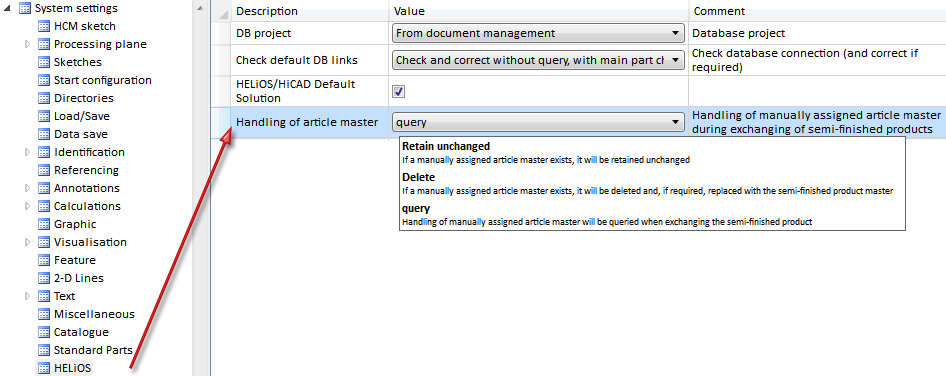 The handling of manually assigned article masters during exchanging of semi-finished products can be specified in the Configuration Editor at System settings > HELiOS.