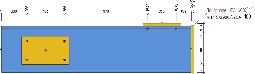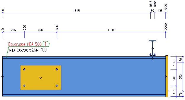 The image below shows a beam with 4 plates for different usages (1=Front plate, 2=Reinforcement plate, (3) Stiffener) and the front view of the production drawing.