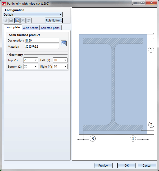 Use this function to connect 2 beams with a welded plate, which can either be fitted flush or with top, bottom or lateral projection. If required, the beams are automatically shortened, lengthened and/or mitred.