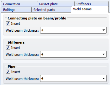 On this tab you specify whether you also want to create weld seams for the connecting plate on the beam (1), for the stiffeners (2), and for the pipe (3). If you want to create weld seams, activate the corresponding checkbox and enter the seam thickness.