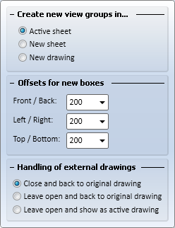 button opens the dialogue window shown below. Here you can determine the size of the boxes by specifying an excess length for different direction, i.e. enlarge the box in this way. Also, you can determine here how external drawings should be handled.