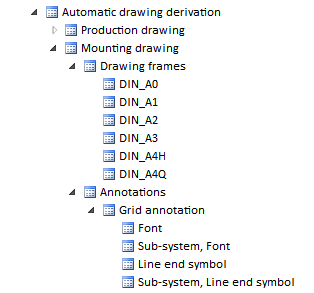 As with production drawings, you can specify various settings for mounting drawings in the Configuration Editor. You can find these settings at er Automatic drawing derivation > Mounting drawings: