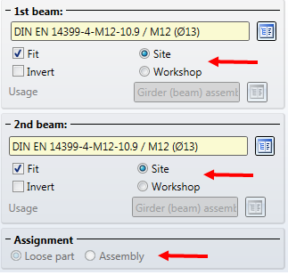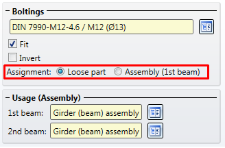 This function now offers the option to define whether the bolting is to be assigned to the assembly of the 1st beam or if it is to be inserted as a "loose part". The Bolting tab has been expanded for this purpose.