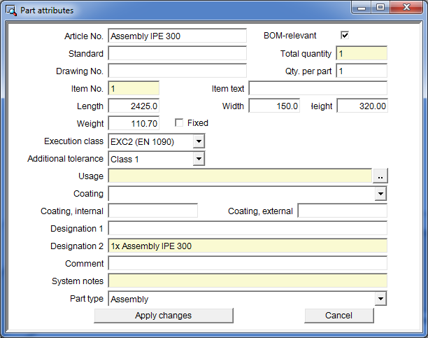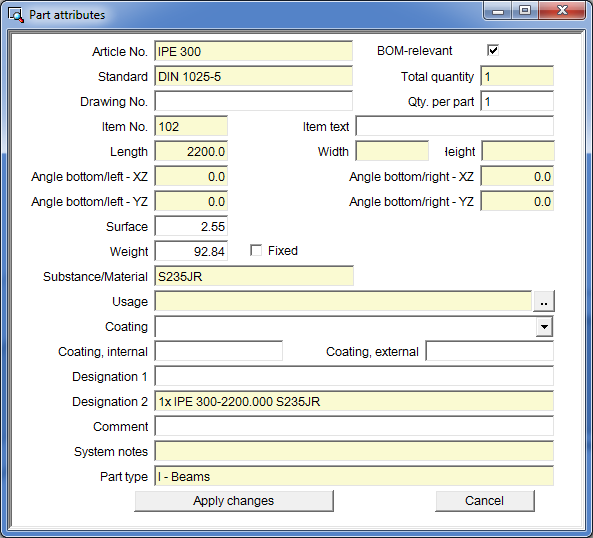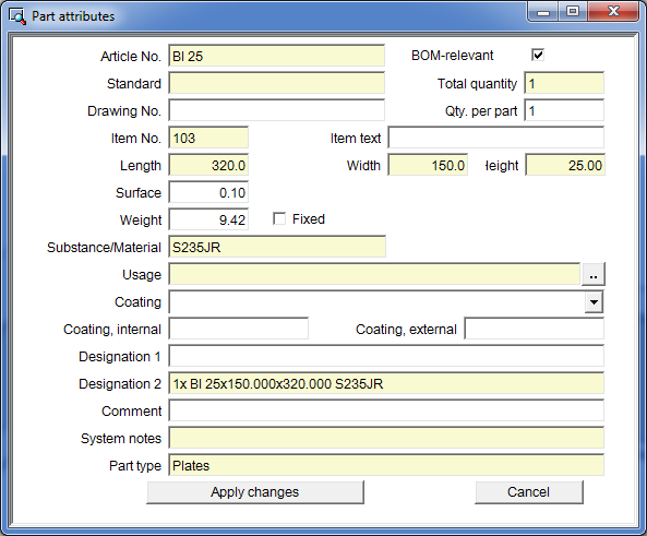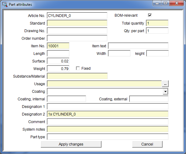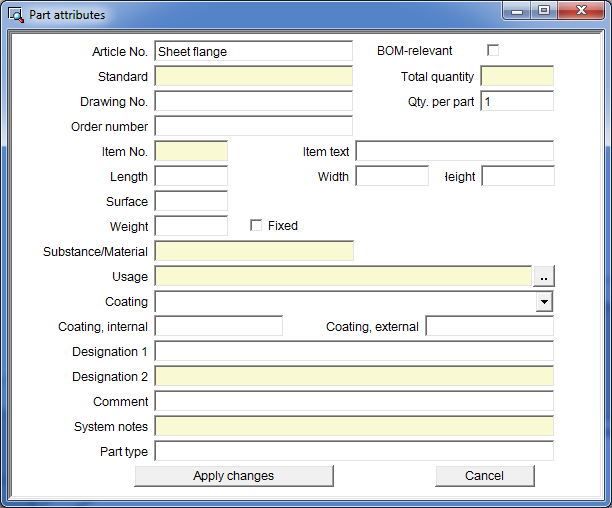 If you have selected the ISD default template for Steel/Metal Engineering for the parameter configuration (s.a.), the Part attributes masks in the HiDAD sys directory will be replaced accordingly. These masks have been slightly modified in SP2. For example, these masks now contain the fields Article No.and Standard instead of the fields "Part name" and "Article number". Also, the position of some fields has changed.
