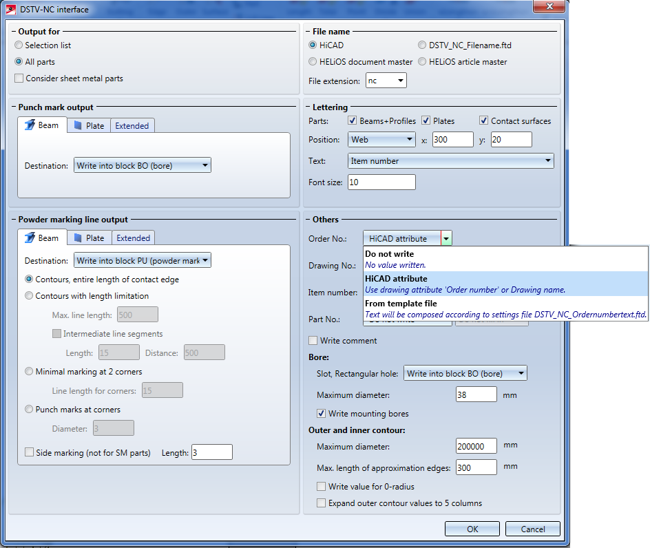 can be configured via template files (FTD) that have been defined for this purpose. Previously the selection took place via the Configuration Editor. From HiCAD 2016 SP2 onwards this can be done directly in the DSTV-NC interface dialogue window.