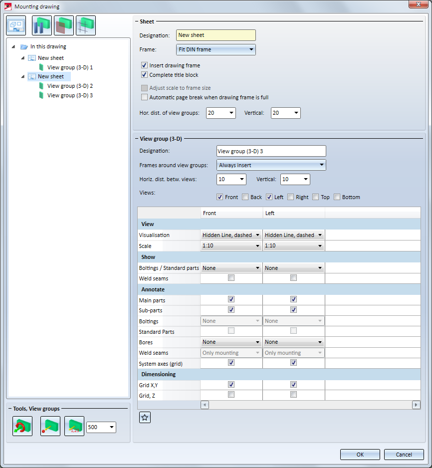 The dialogue window for the creation or modification of mounting drawings has been revised and enhanced. For example, the bounding boxes for view groups can now be changed subsequently, and mounting drawings can now also be output to external drawings.