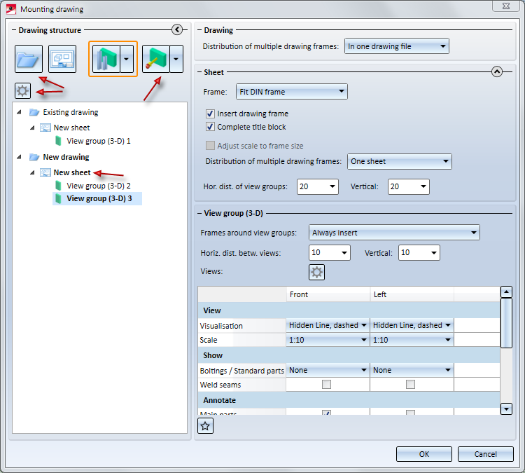 Via the parameter Include new parts in list views of mounting drawings you can specify whether created new parts are to be shown or hidden in the views of the mounting drawing upon its updating.