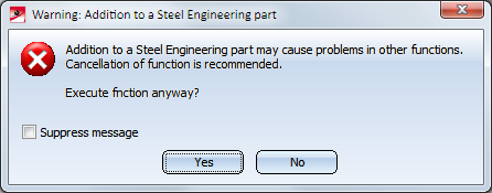 The adding of 3-D parts to a Steel Engineering parts may cause problems with subsequently called functions, e.g. mitre cuts, Steel Engineering connections, NC/NCX export, deriving of drawings, etc. Attributes (e.g. weight, length, etc.) may also be calculated incorrectly.