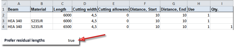 In contrast, if you set the Prefer residual lengths switch to true, two 6000 mm bars and one 6500 mm bar (because of Qty. = 1). Here, the amount of waste will be 2 x 1000 mm.