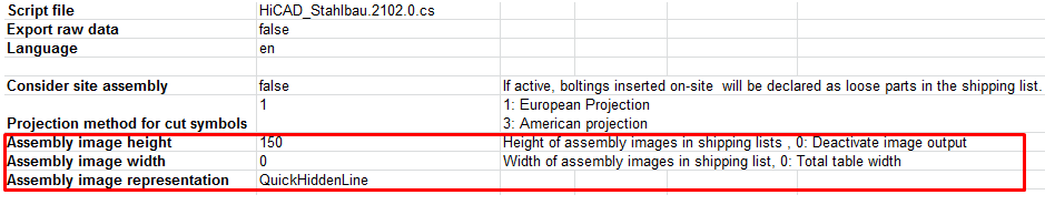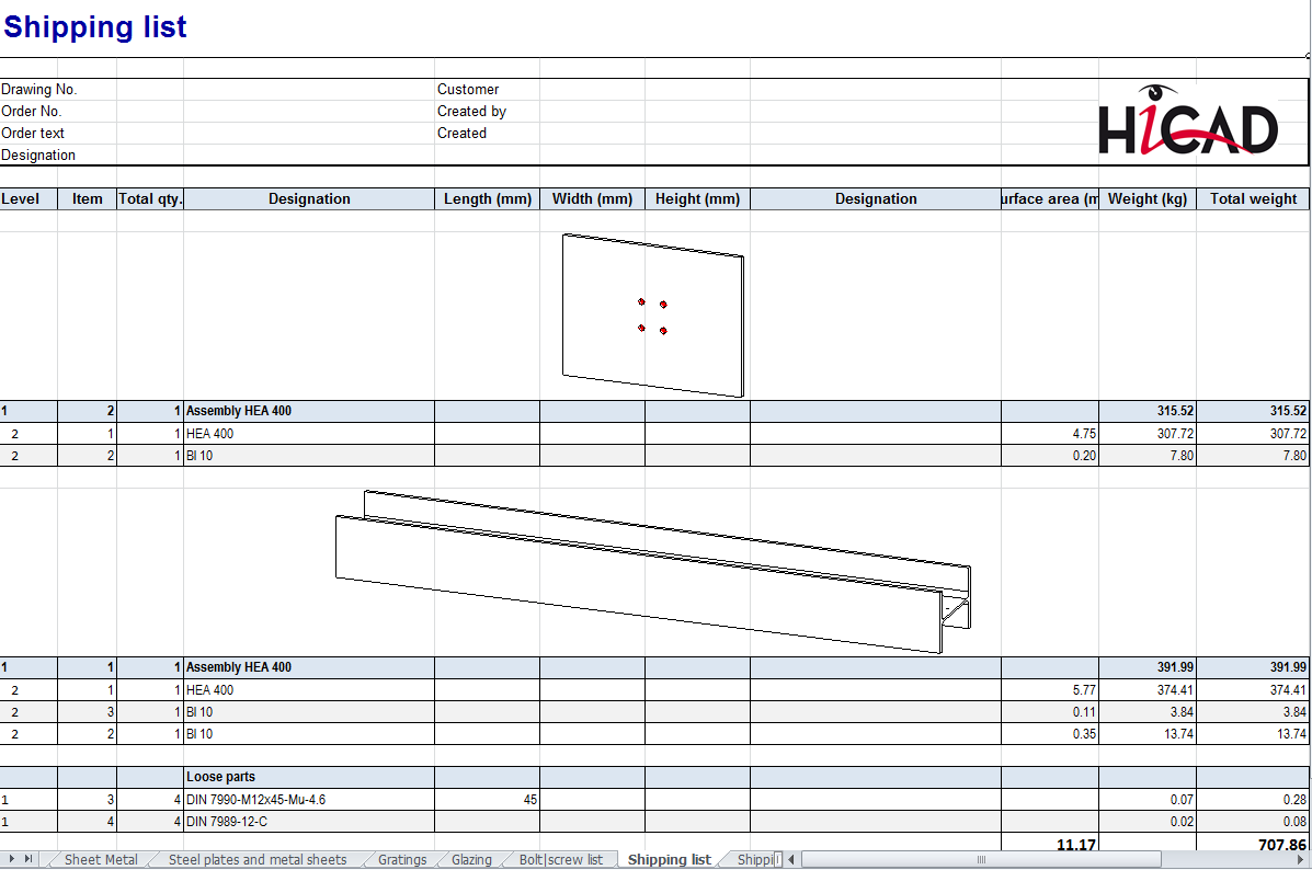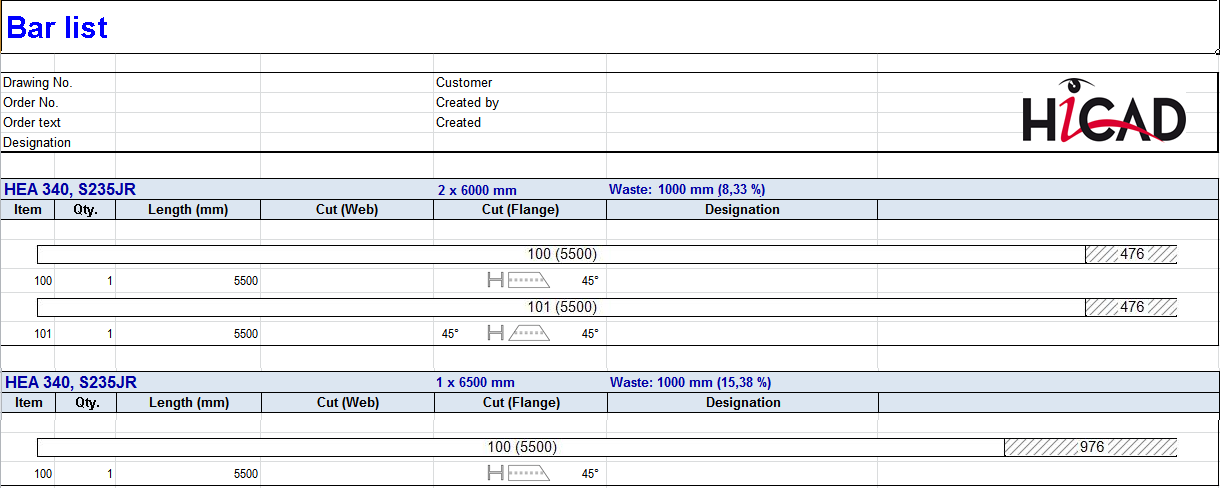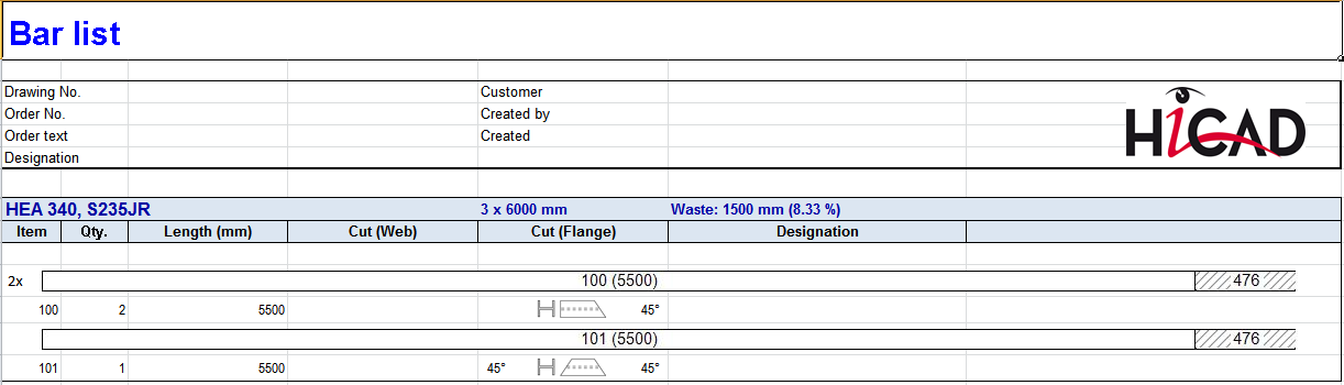 For this purpose, the Bar settings sheet has been added in the HiCAD_Stahlbau.xlsx template for the output of BOMs to Excel.