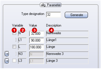 The designation of the selected variables group is in the top line of the box., e.g. General parameter. The Type designation entry field at the top of the box shows the die Type designation contained in the corresponding record. The table is comprised of four columns: Checkboxes for row selection (1), the names of variables (2), the values of variables or name of the variables, from which the value should be taken over in the same record (3), and Descriptions for variables (4):