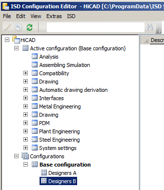 To prevent an accidental overwriting of the base configuration, i.e. the ISD default setting, you should only create derivations of company-specific configurations. To restore the ISD default settings, the configuration database (HiCAD.cfgdb) must be re-installed.