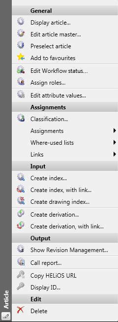 A large part of the editing and processing functions for Articles can be found in the context menu of article items in search result lists (Find > Simple search > Articles), of items in the Articles tab, or of article items in the Objects tab of the HELiOS Desktop.