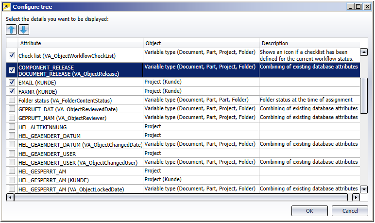 As you would do for the configuration of result lists and Properties window, activate the checkboxes for the attributes you want to be displayed, and deactivate the checkboxes for the attributes that you do not want to be displayed. Confirm with OK.
