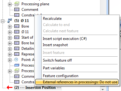 If you want the external references of the processings to be preserved, you can switch the option to Use again afterwards. The position of the part will then change accordingly after recalculation.