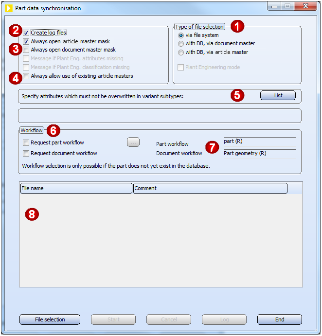 Click the File selection button and select the file(s) for which you want to perform a part data synchronisation. The type of file selection has already been determined by the setting in area (1) (see above). The selected files will then be displayed in a table.
