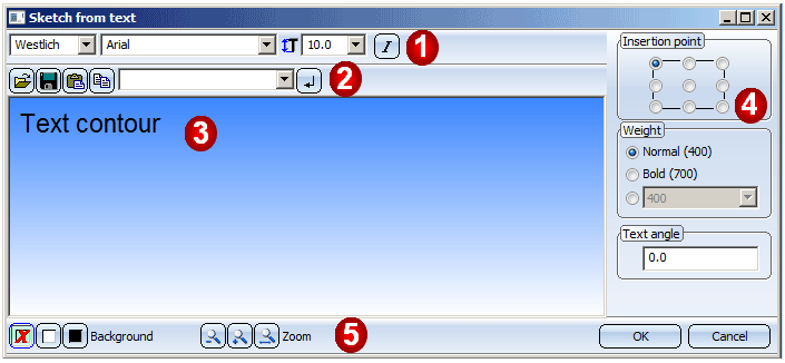 When you call the function, the Sketch from text dialogue window will be displayed, which is largely operated in the same way as the 3-D Text Editor.