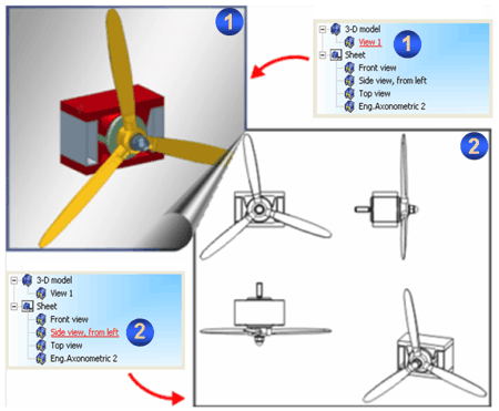 Model views are genuine 3-D views, e.g. any detail and sectional views, cut-outs in any depth and direction, list views with particular assemblies or parts and so on. This does not alter the position of the views in the sheet area.