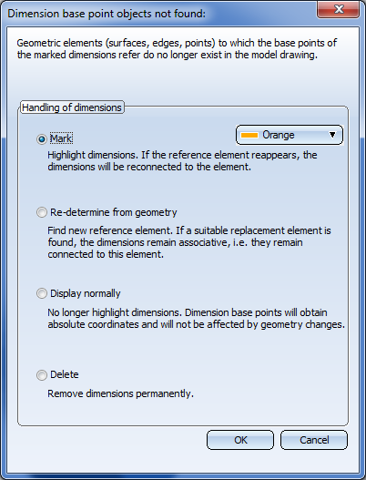 Dimension base points refer to geometry elements, i.e. surfaces, edges or points. If these elements are removed, the dimensions will lose their reference and will no longer be associative. In such cases the Dimension associativity - Update functions can no longer be carried out properly. If this is the case, the non-updateable dimensions will be highlighted and the Dimension base point objects not found dialogue window will be displayed:
