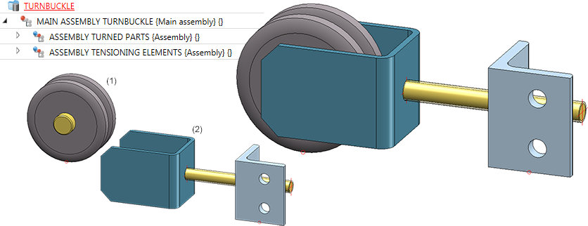 Let's take a look at the turnbuckle shown below, which consists of the assemblies Turned parts (1) and Tensioning elements (2).