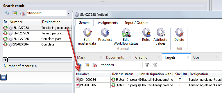 This automatically creates a Bauteil – Teilegeometrie (Part - Part geometry) link between the article and the new geometry. As a result the article Tensioning element complete, for instance, is now linked to 2 different geometry models.