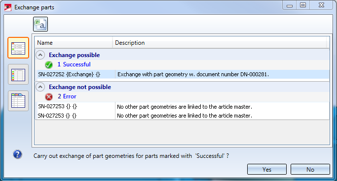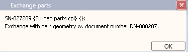 If the exchange is clearly possible for all parts, it will be carried out automatically. If this is not the case, the result of the check will be shown in a log in the Part exchange window, e.g.: