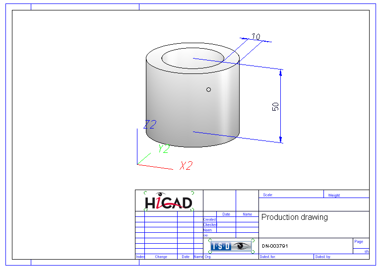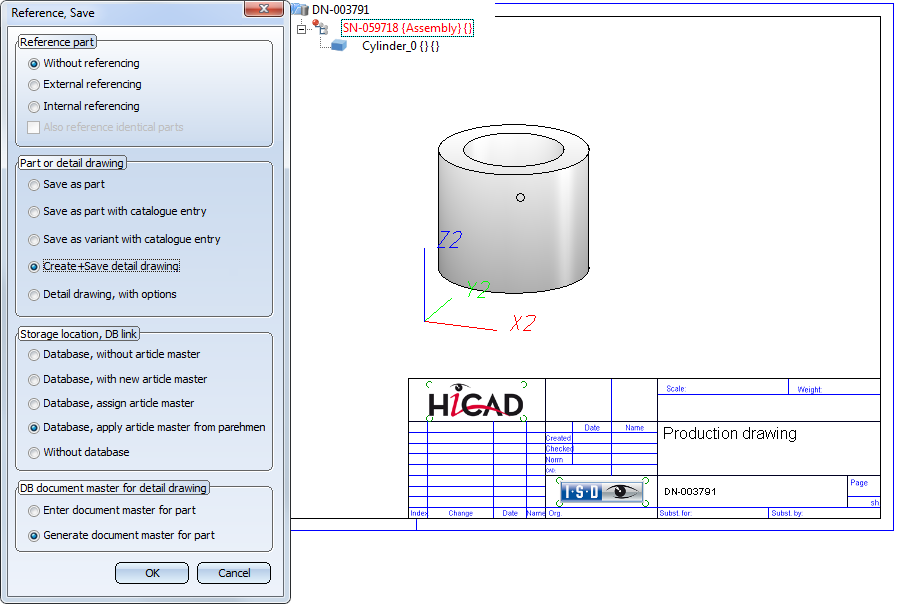 The saving of the completed articles Assembly Tensioning elements and Assembly Turned parts in HELiOS took place here by means of the function Drawing > Save/Reference > Reference part, Save, Detail drawing