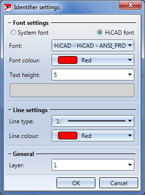 When this function is selected for the first time in the current drawing the default settings in the window are those specified in the Configuration Editor. To change these settings, open the Configuration Editor and select Drawing > Views > Ident > Details. When you call the function again, the last used text and line parameters will apply. |