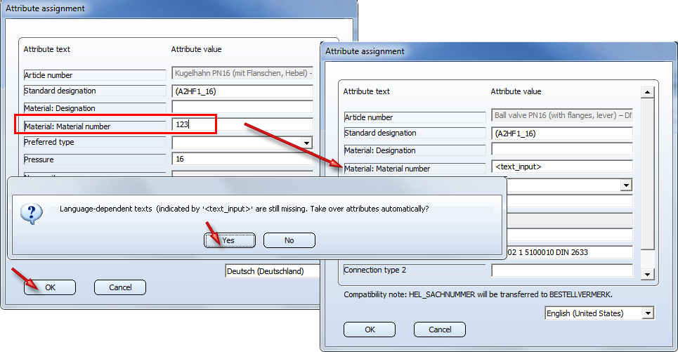 As of HiCAD 2019, changed attribute assignments can be automatically taken over into the other languages. If attributes are missing, the following message will be displayed: