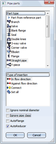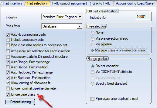 When inserting parts you have now the option to temporarily ignore the pipe class. For this purpose the Ignore pipe class checkbox has been added in the selection window for pipe parts. The default setting of this checkbox can be set on the Part selection tab of the Plant Engineering Settings dialogue window.