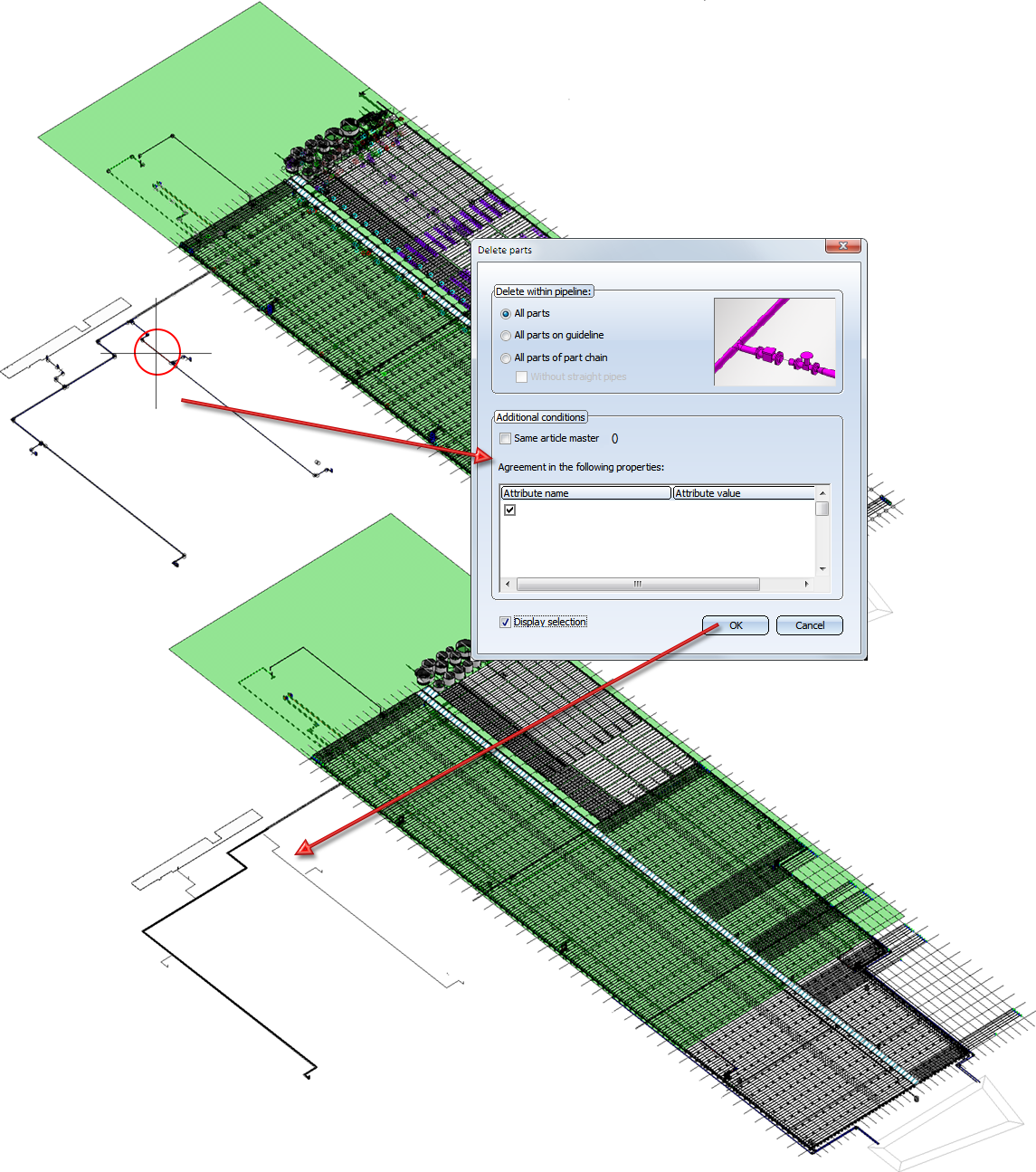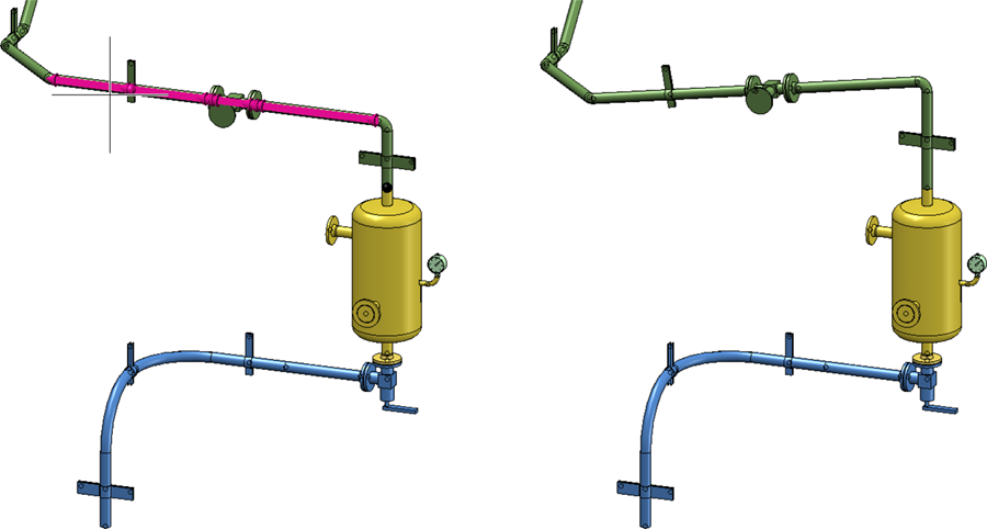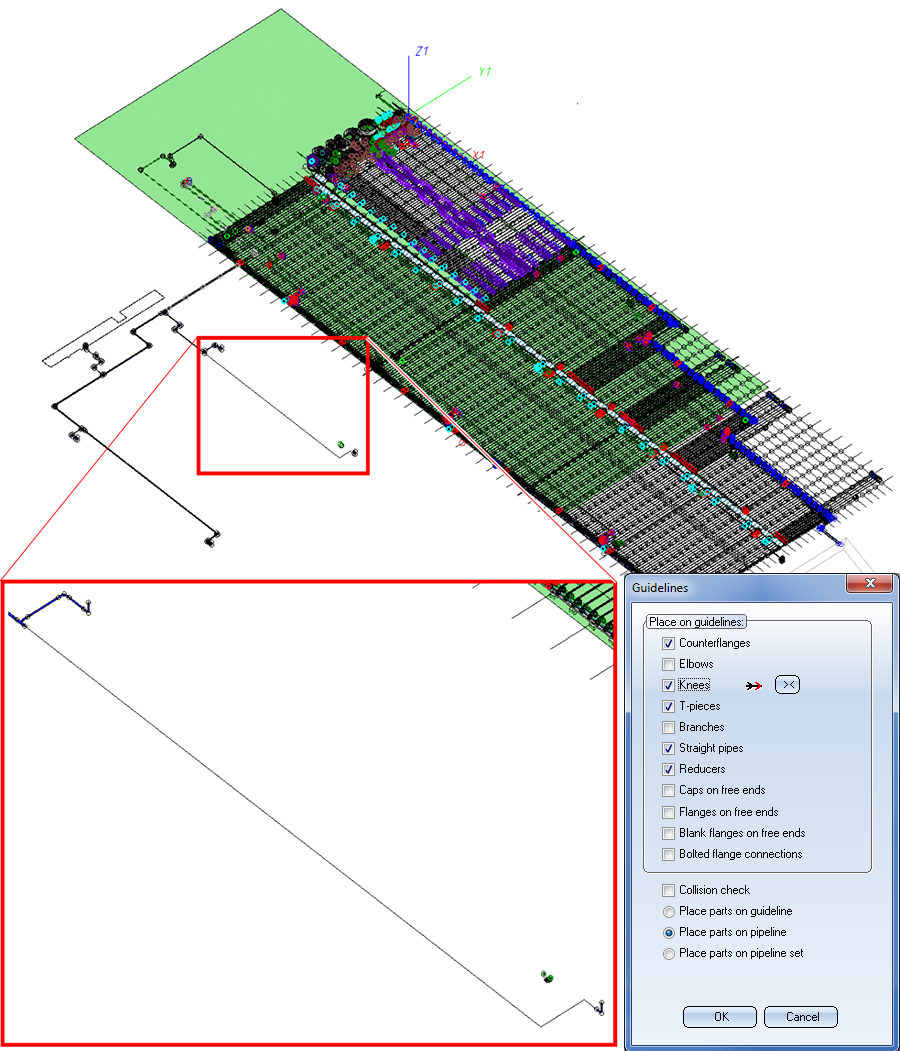 After insertion of a new guideline and during processing of existing guidelines HiCAD will now check whether the relevant pipeline contains a guideline on which the start point and also the end point of the new/processed guideline is located.